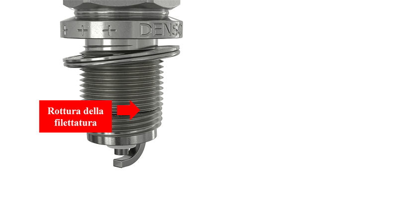 La coppia di installazione di una candela dipende dal diametro della sua filettatura. Se alle candele è stata applicata una coppia eccessiva, la filettatura si allungherà causandone la rottura, come illustrato nella Figura 5.